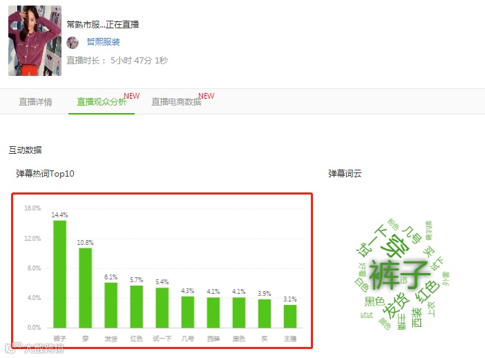 同时,飞瓜数据对「哲熙服装」近几次的直播进行了【直播监控】,可以分钟级监控直播间的音浪收入、人数峰值、弹幕内容。我们可以发现「哲熙服装」观众最多留言的词是“试一下”、“发货”等等,那么她是怎么调用了观众的积极性的呢?