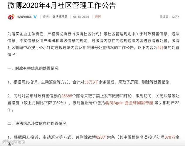 5月18日消息,微博官方账号@微博管理员今日4月社区管理工作公告,公告显示,针对涉黄信息,根据网友投诉、主动巡查等方式,4月共删除微博828万余条(其中微博监督员投诉处理678万余条)。