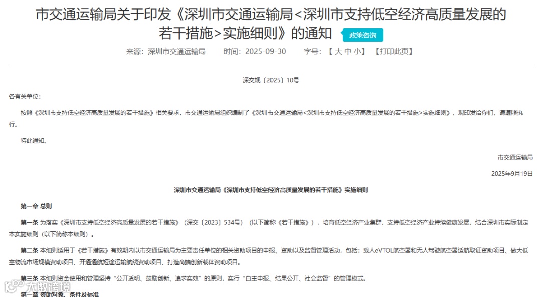 9月30日,深圳市交通运输局正式发布《深圳市支持低空经济高质量发展的若干措施》实施细则,为低空经济发展注入强劲动力。该细则将于2025年10月9日正式实施,有效期至2026年12月31日。