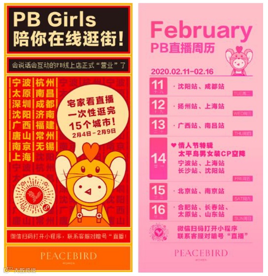 太平鸟通过不同地区轮流直播、小程序分销、微信秒杀、微信线上会员专场等活动,保持着与消费者的连接,并实现了通过直播内容种草,借助优惠机制促进转化的目标。