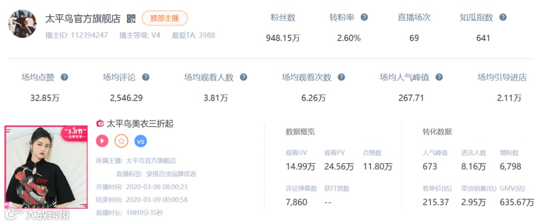 根据知瓜数据显示,太平鸟天猫官方旗舰店场均观看人数可达到3.81万人次,三八节期间,也在淘宝直播间创造了635万GMV的成绩。