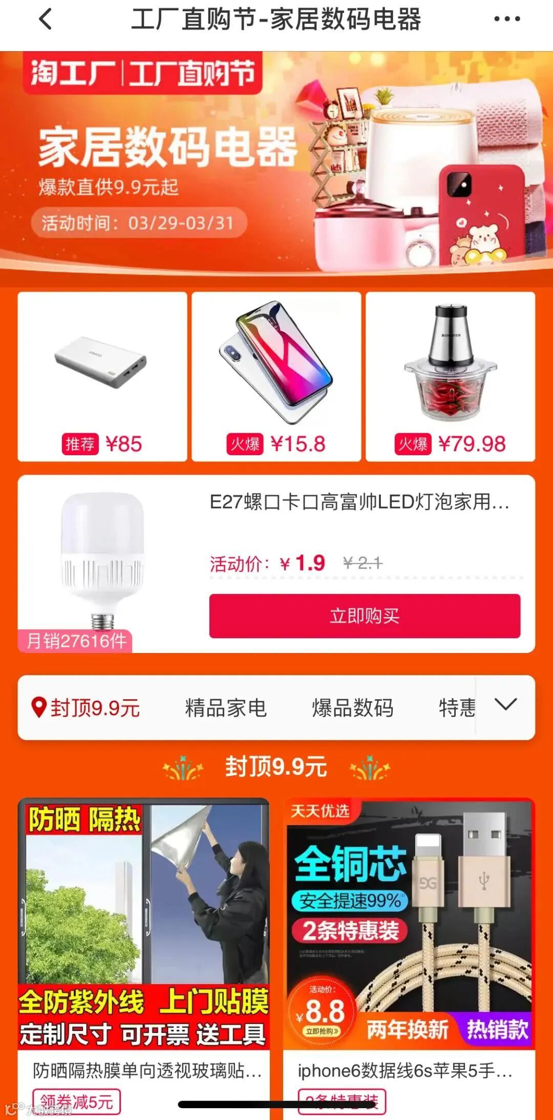 3月27日,淘宝特价版宣布,将从 3 月 29 日开启工厂直购节,为期三天,淘宝特价版将通过工厂直供的方式为消费者提供极致性价比的便宜好货。淘宝方面表示,工厂直购节期间,消费者在淘宝特价版上购买工厂直供货品,将一律按照最实惠的批发价进行结算,鞋架、凳子、灯泡等多款产品封顶9.9元。