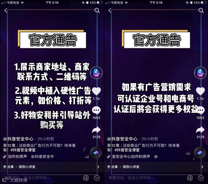 3月29日消息,抖音安全中心发布通告《禁止发布和传播不符合抖音用户协议的商业广告行为》,如有广告营销需求,可认证企业号和电商号获得更多权益。