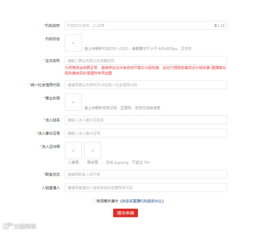 据了解,机构名称、机构标志、主体名称、统一社会信用代码、营业执照、法人姓名、法人身份证号、法人证件照、联系方式、入驻邀请人这九项是申请MCN所需填写的资料。