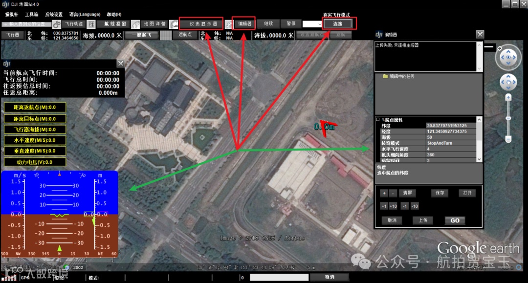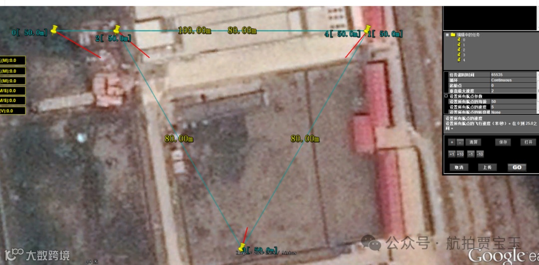 画好后点击上传,编辑器上面显示上传成功后,点击GO,飞机就飞往设置的起飞点开始执行航线任务了。