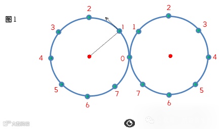 8字飞行中,每一边都有8个桶(共有中心桶),到每一个点位时,都有一个参照飞机状态,理想状态是飞机机头指向方向与此时飞机所在位置的圆的切线方向一致,如图1(俯视图)左圆的1点处,图2(俯视图)是当飞机飞行时,眼睛看飞机尾巴和机头的两个脚架的视觉效果,可以看到在每个桩桶处,看两个脚架的视线是有一个夹角的,对应到实际中,在这些点应该能同时看到脚架的左右两边,只是看到的多少有区分;