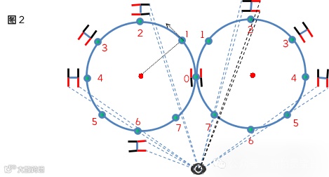 在图2的右圆2点处,可以看到眼睛只能看到尾巴的两个脚架,脚架的头只能看到1个,另一个被挡住了;