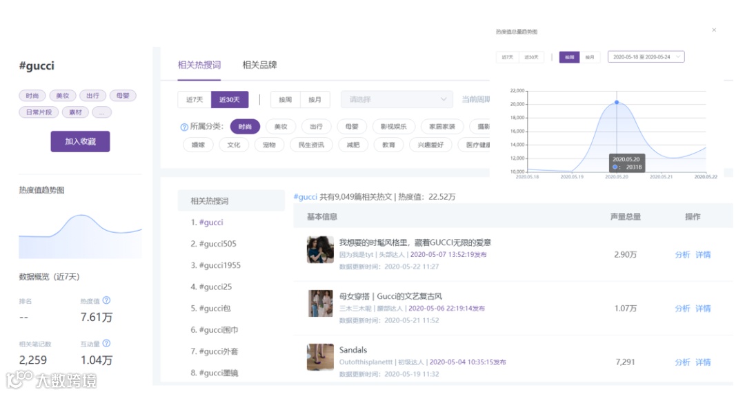 以小红书为例,作为一个专业种草平台,小红书向来是品牌们的兵家必争之地。千瓜数据显示,近30天,Gucci共有9千多篇相关热文,其中“520个古驰故事”在小红书持续发酵,520当天的相关热度超过2万,达到近期峰值。相比而言,同样在520期间主推经典包袋的LV,即使粉丝数比Gucci多,近30天相关热文2千多篇,就显得有些单薄了。