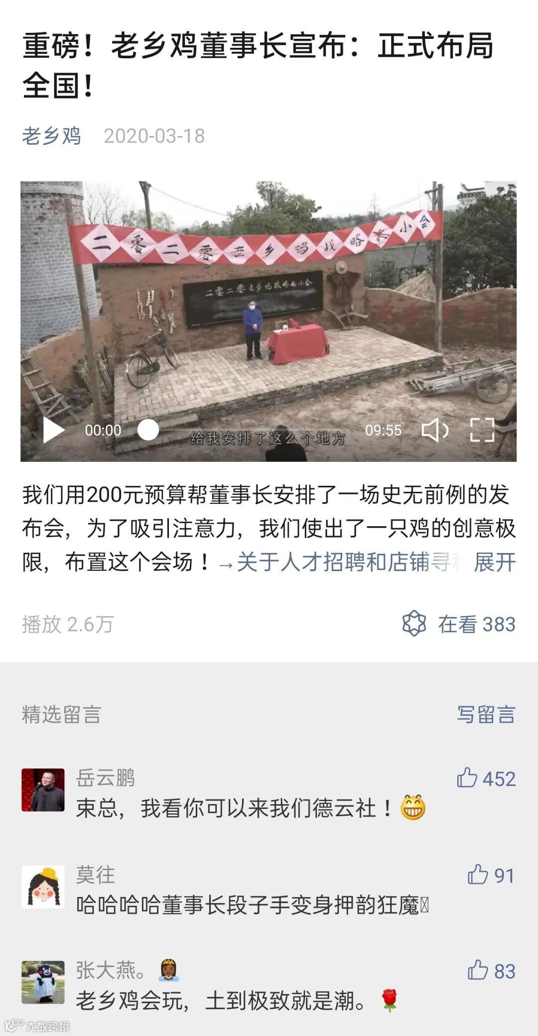 从此前的手撕员工联名信到这次的“土味”发布会,从中我们能看到老乡鸡品牌身上的“网红基因”。