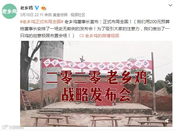 说起品牌战略发布会,想必大家脑海中必定是高端、大气、上档次的画面在闪现,大多数人不会想到一个品牌的战略发布会有一天会只有200元预算,并且在村口举行,但老乡鸡就这么干了!
