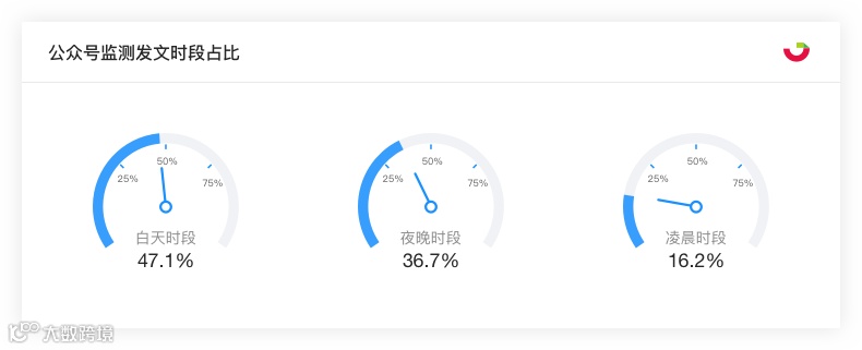 其中发文在白天时段的文章占比47.1%,夜晚时段占比36.7%,凌晨时段占比16.2%。