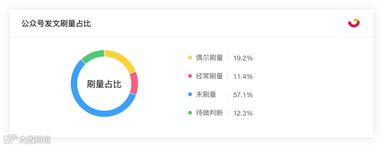 在全年监控的账号中,偶尔刷量的公众号占比达到19.2%,长期刷量的公众号占比为11.4%,而暂未监测到异常数据的公众号占比为57.1%,剩余12.3%须做进一步判断。从数据上看虽然绝大多数公众号都能做到客观真实的展示运营成果,但对阅读数据造假的行为也是普遍存在的。