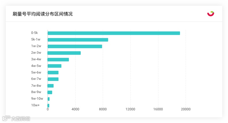 其中主要刷量的号平均阅读在5000以下的占到了50%以上,越往后刷量的情况越少,当然这也和不同量级的公众号总数有关。但是往往平均阅读越高的号,其刷量的水分也是越大的。