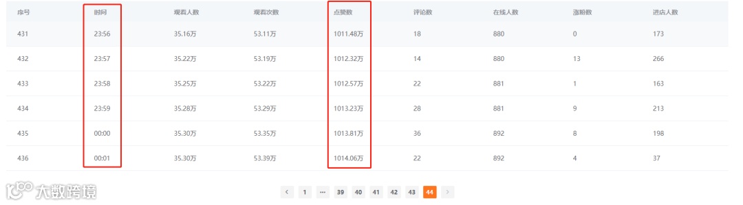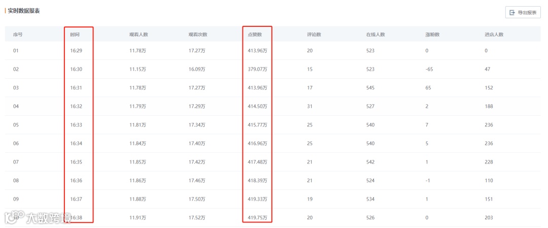 知瓜数据实时监测功能就能够对直播间的实时点赞数进行抓取,可以看到该播主从16:29分的413.96万赞到直播结束后的1014.06万赞的变化过程。