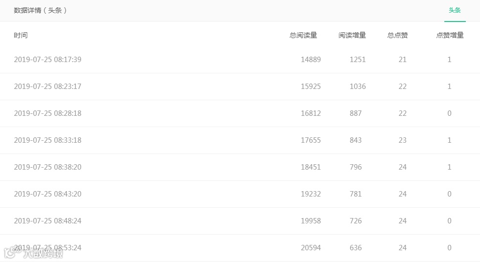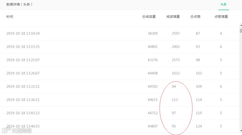 如果看曲线图你还觉得不明显,那么下面的数据增量异常情况更加直观,公众号是12点发文的,截止到13:21分数据的增量都稳定在2500左右,而这个时间段正常会出现减量下滑,但数据并无这样的表现。