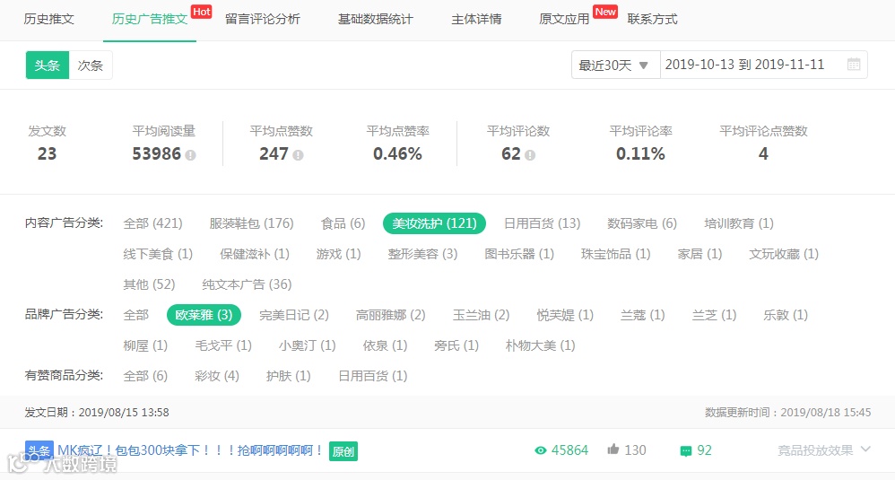 一般运营3年以上的公众号会有历史广告推文的数据,可直观显示号主接的是哪个品类多的广告,结合评论和点赞信息综合查看粉丝的接受度。
