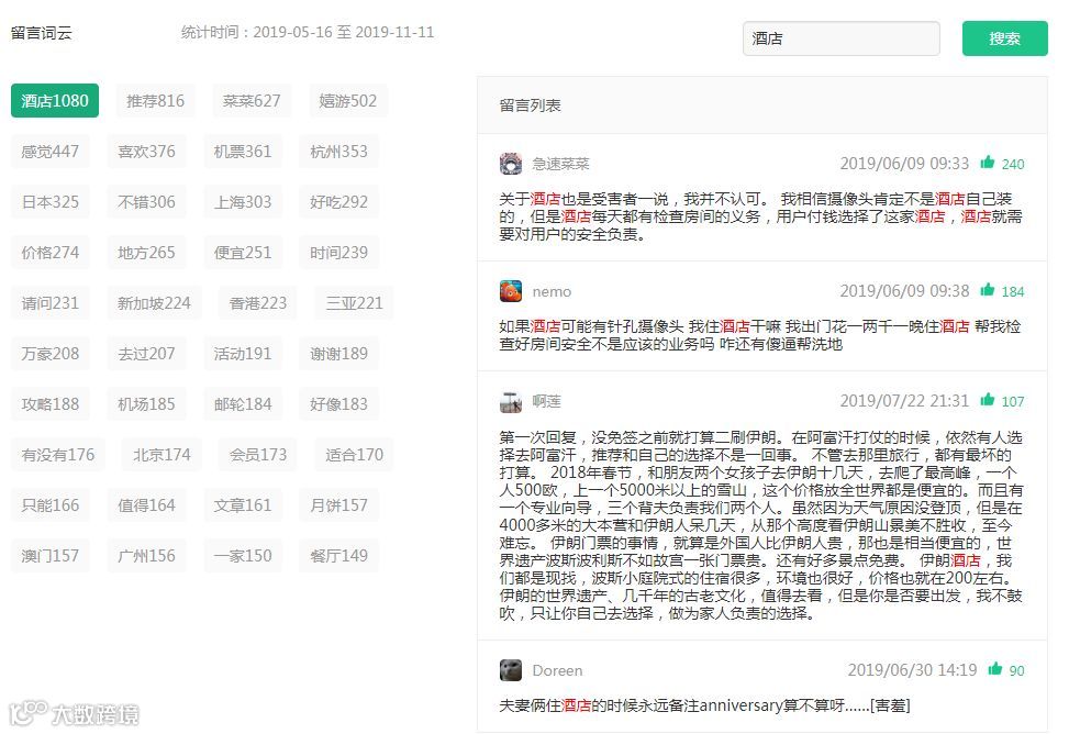 通过选择酒店关键词,能够看出用户留言质量度高有两个方面,第一文章的留言点赞数高,第二则是用户回复的内容质量高,围绕产品会补充说明更多的情况。