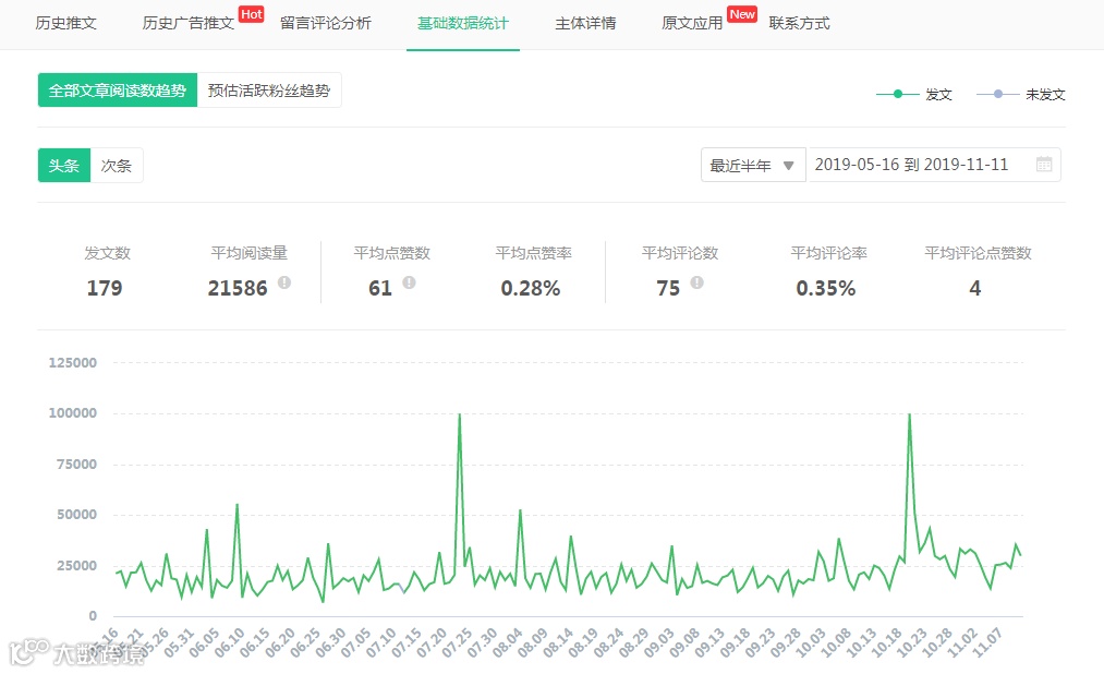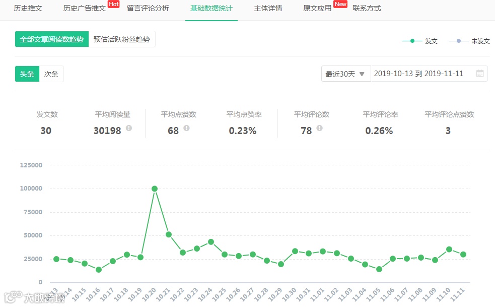 使用西瓜数据的基础数据统计功能,并且选择近30天维度的时间,数据除了显示10月20日当日达到10w+的水平,更能看出公众号的波动值较为稳定,整体的阅读量数据是在3万左右浮动。