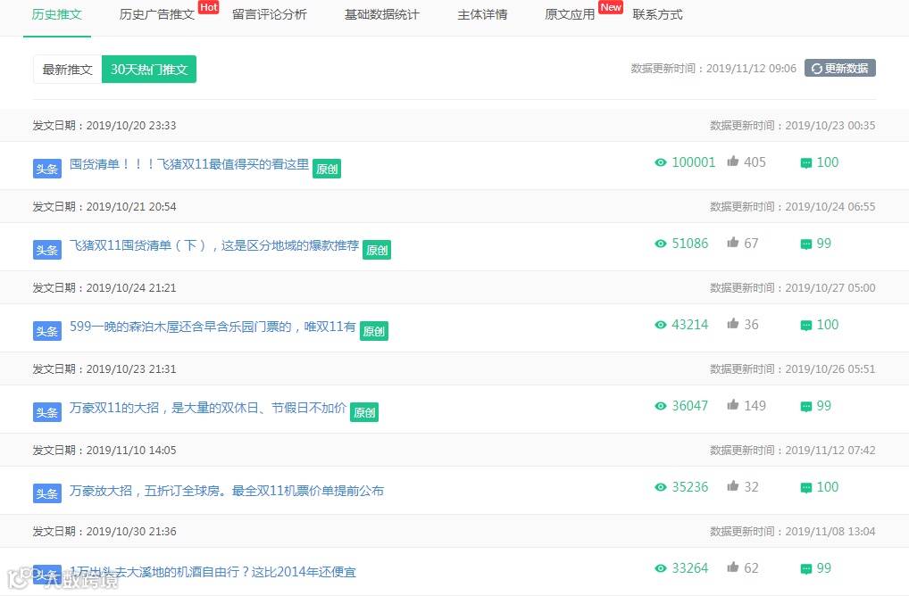 譬如说最新的文章《囤货清单!!!飞猪双11最值得买的看这里》,这篇是20日晚上23:33分推送,在21日中午14点21分阅读数据就已经逼近10w+。