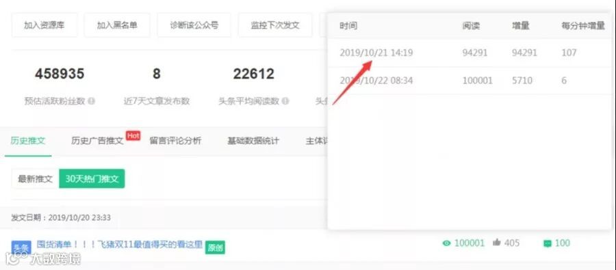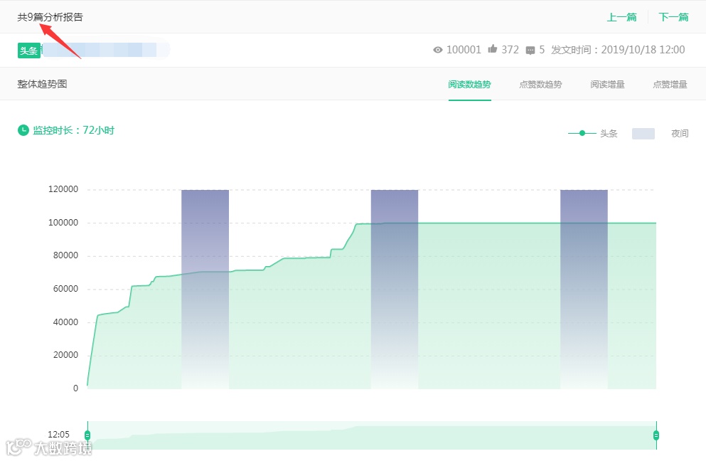 但这么做会提高投放的风险指数,现在大部分公众号都有直接的阅读增量趋势查看,可节省监测时长,使用西瓜数据的投前分析即可完成。