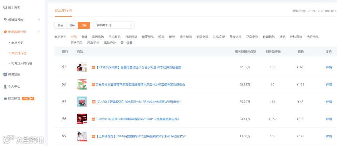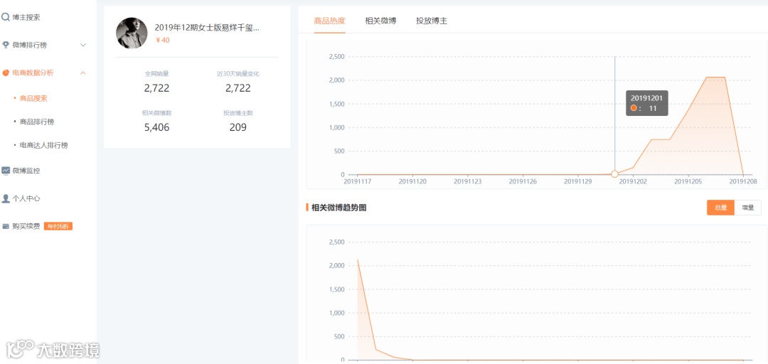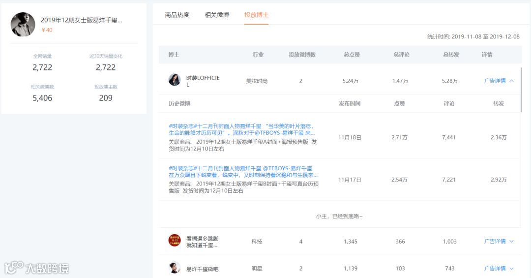 点击右侧的详情,可以看到该商品的商品热度-全网销量趋势图,相关微博,以及商品具体的投放博主。