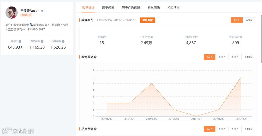 如果你想查看更详细的数据,点击右侧的"详情",还可以查看达人的数据统计情况,对某个你感兴趣的带货达人进行多纬度分析。 例如微博数据概览、历史微博,具体的广告微博数据、粉丝画像等通通都有哦。