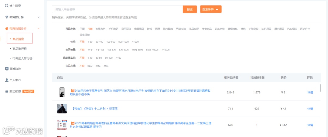 今天小编就为大家推荐下我们西瓜数据微博版的电商数据分析功能,它可以解决你的选品困扰,帮您快速找到适合 在微博上投放的商品和优质带货达人。