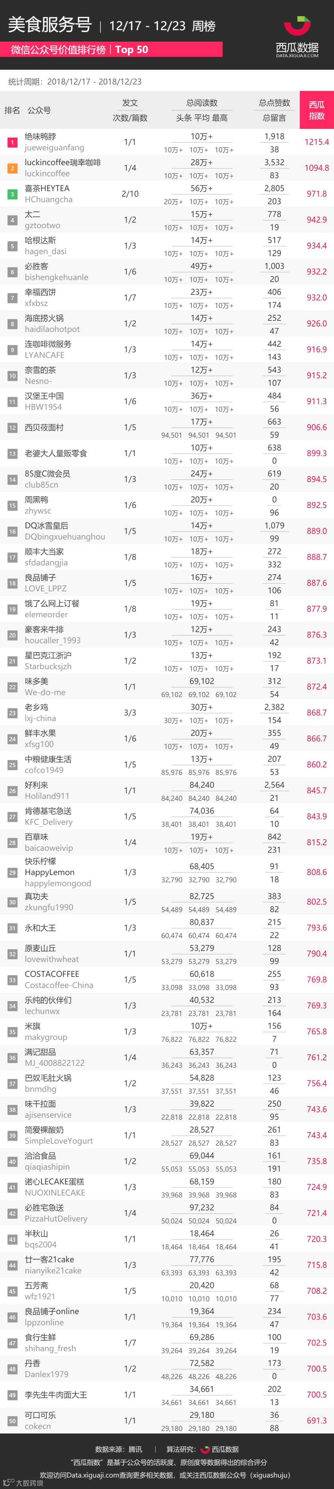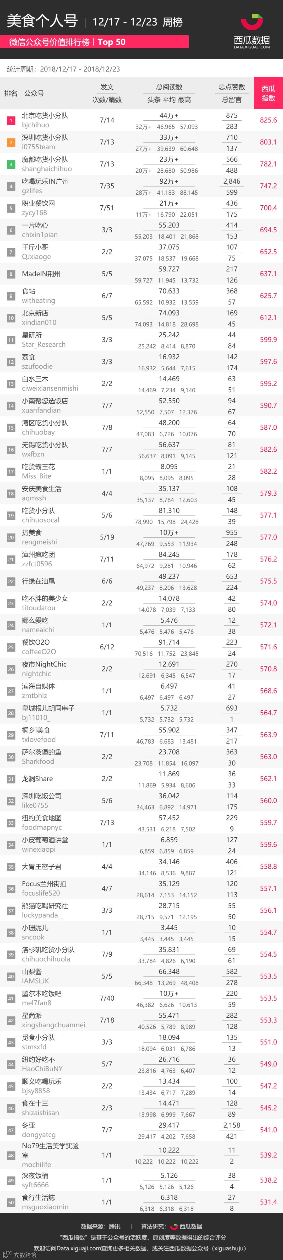 本次公众号排行截取 2 篇美食公众号周榜TOP50,分别涉及: