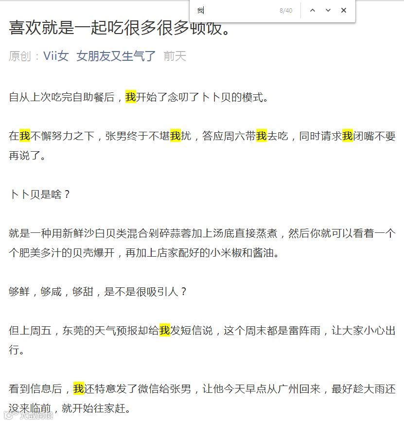 秉持着要满足好奇心的想法,西瓜手动搜索了「女朋友又生气了」近期的一篇文章,发现“我”这个极具个人色彩的人称出现了40次!可以感受一下它们出现的频率。