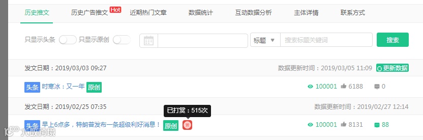 举例公众号【时寒冰】获得西瓜数据2月总榜的第19名,而他的发文数据是最少的,但通过西瓜数据看他2月25日的推文,赞赏次数高达515次,另外这篇文章有近10条留言点赞数在1000以上,其中有2条是3000以上。