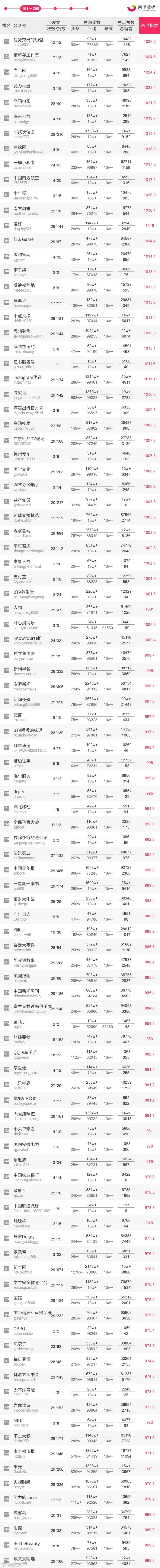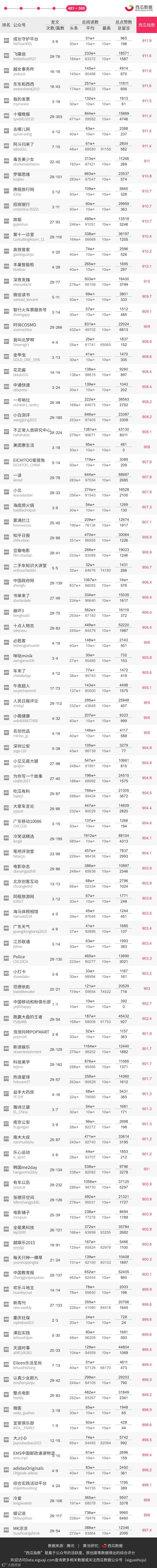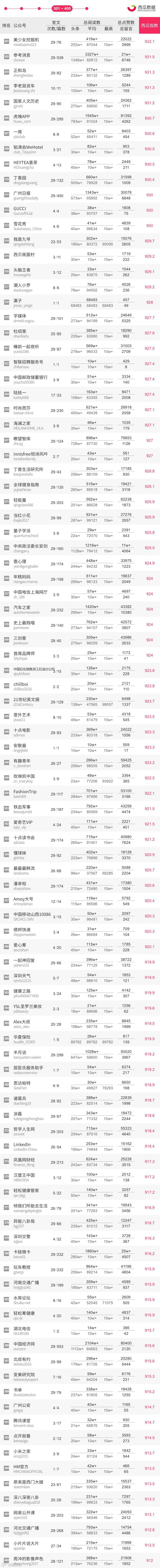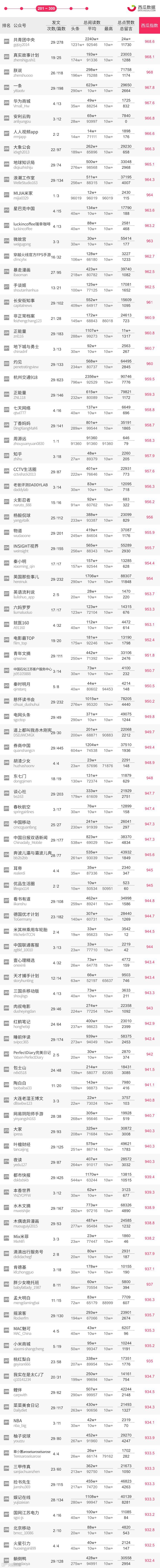 在本份月榜中除了西瓜指数外,还会显示指定周期内公众号发文次数、发文篇数、总阅读数、头条总阅读数、平均阅读数、最高阅读数、总点赞数、总留言数等数据。这些数据显示更加方便大家直观对比公众号之间的数据。