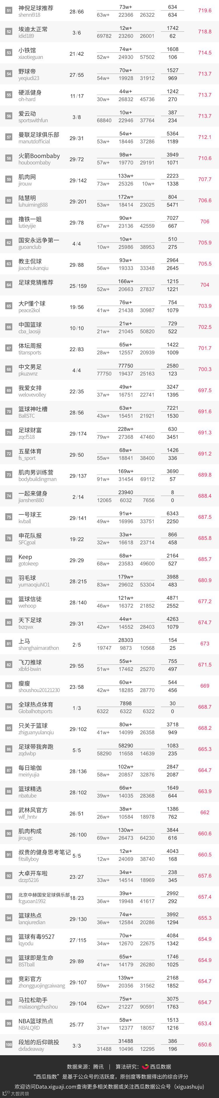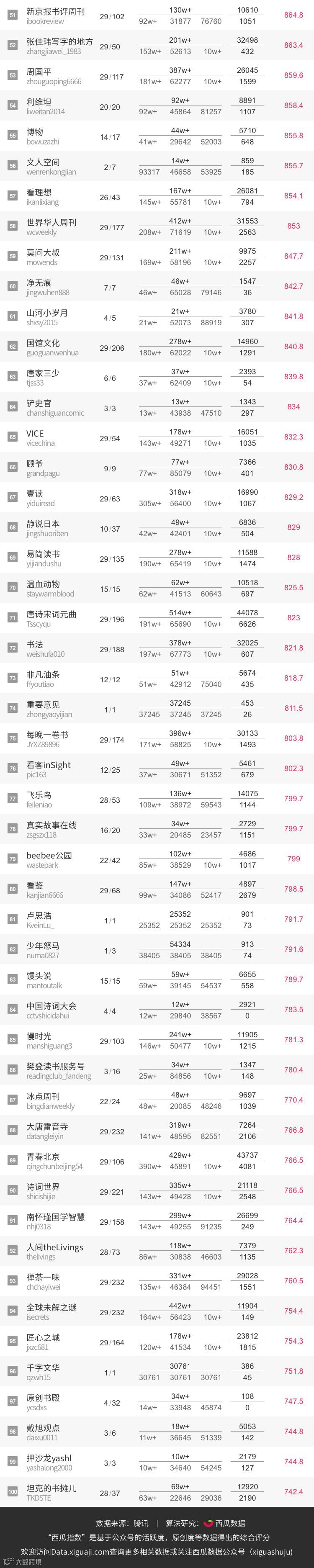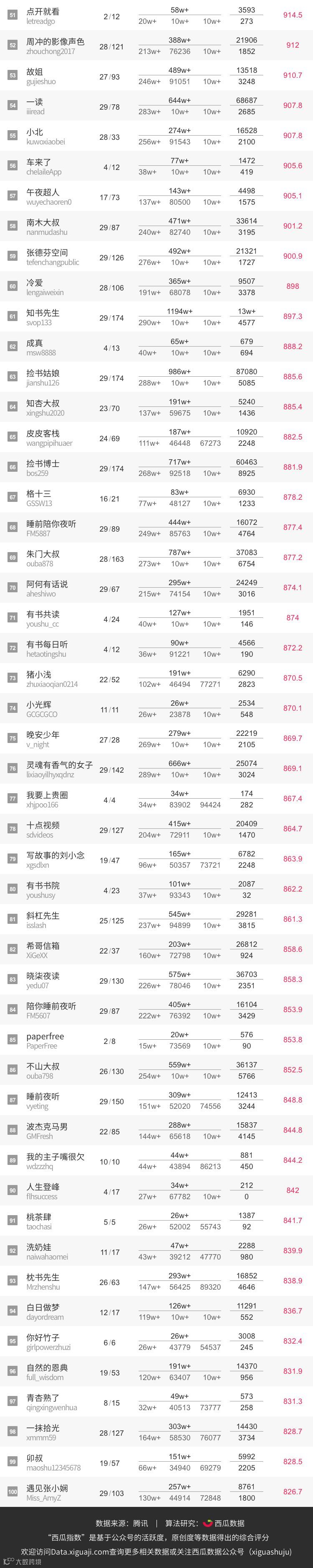 在本份月榜中除了西瓜指数外,还会显示指定周期内公众号发文次数、发文篇数、总阅读数、头条总阅读数、平均阅读数、最高阅读数、总点赞数、总留言数等数据。这些数据显示更加方便大家直观对比公众号之间的数据。