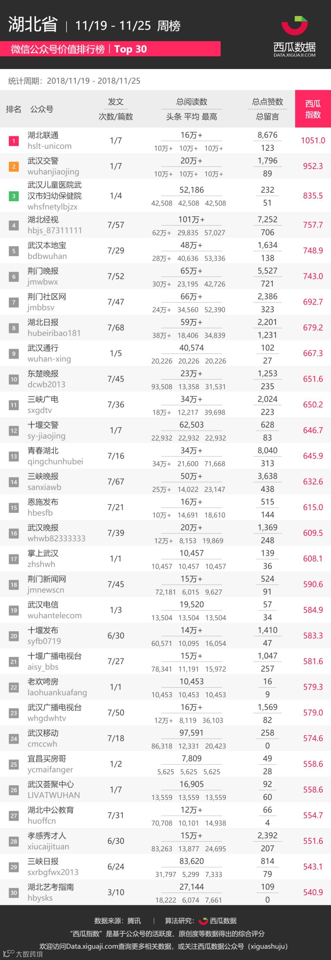 在本期「湖北省-周榜」中,前三分别是“湖北联通”、“武汉交警”、“武汉儿童医院武汉市妇幼保健院”。
