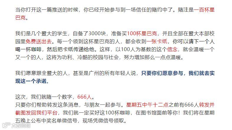例如“一百杯星巴克咖啡和你赌未来”活动。他们采用接力的方式,请100位陌生人喝咖啡,再鼓励被邀请的人邀请下一位陌生人喝咖啡,将温暖传递下去。这个活动其实是对抗社会冷漠的一种举措,输出「我要WhatYouNeed」的一种价值观。