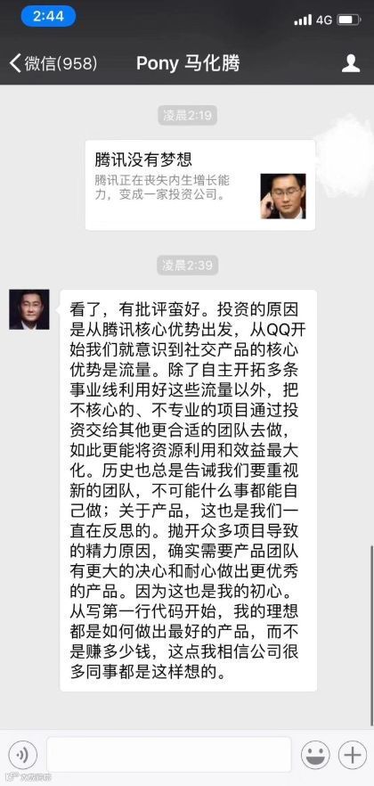 随后一张用马化腾作为头像的微信聊天记录流出,疑似马化腾回复此文:看了,有批评蛮好。