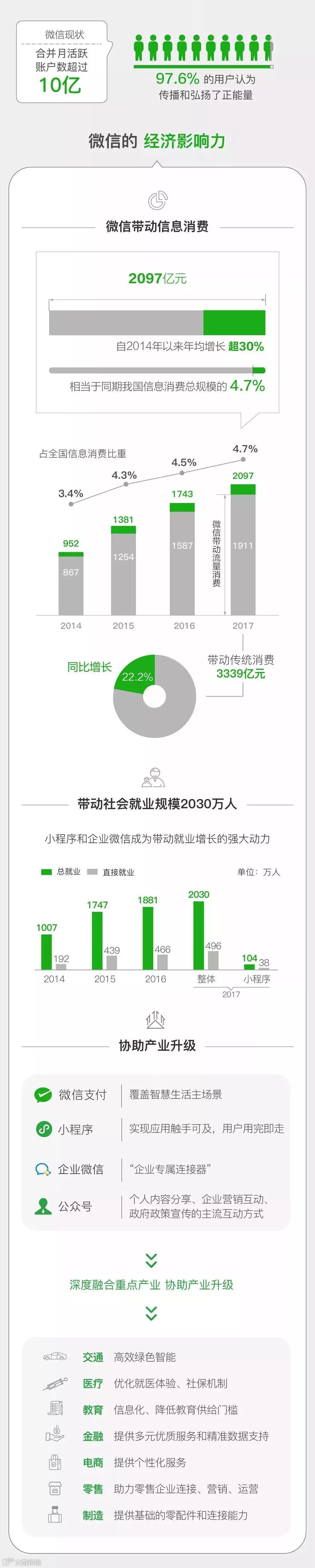 据微信派 中国信息通信研究院产业与规划研究所发布的《创新生态共同体 助力经济新动能——2017微信经济社会影响力研究》报告显示: