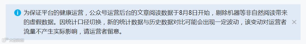 “公众号运营后台的文章阅读数据于8月8日开始,剔除机器等非自然阅读带来的虚假数据。”