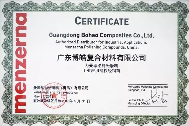 广东博皓与曼泽纳抛光磨料(青岛)公司由于同样肩负着重要行业使命,对沿用产品抱有十分相近的理念,一直致力于把更好、更优质、更专业的服务提供给客户,于2017年7月达成战略合作,广东博皓复合材料有限公司成为曼泽纳公司的抛光磨料工业应用授权经销商。