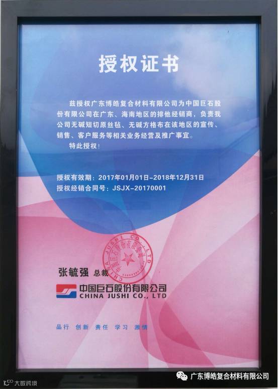 中国巨石股份有限公司是全球最大的玻璃纤维专业制造商,广东博皓是中国知名复合材料服务商。博皓与巨石达成战略合作伙伴关系以来,双方遵循互联共进、互信共赢的精神,精诚合作,共同开拓市场,博皓团队刷新了巨石玻纤产品在广东地区的销售历史,创造了一个又一个辉煌业绩,于2014年、2015年连续两年荣获中国巨石最具成长性合作伙伴奖项! 2017年中国巨石再次授权广东博皓为广东、海南地区的排他经销商,确立战略性合作伙伴关系!相信博皓与巨石的紧密合作,将成为行业佳话!我们将以高品质的产品、全面系统的技术服务全心全意地为客户解决问题、创造价值,更好地推动复合材料行业技术创新!