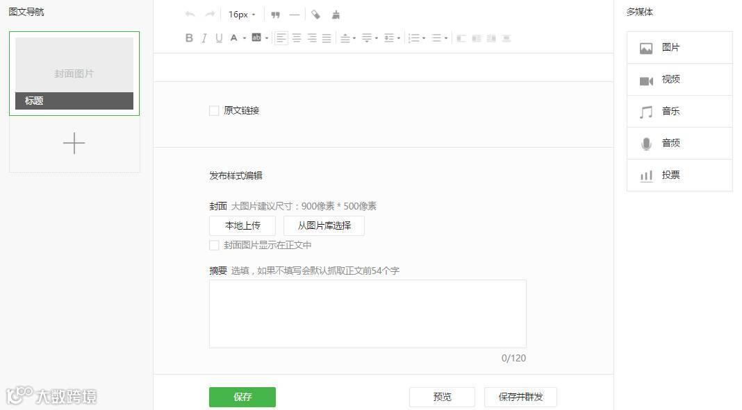 新版编辑器主要分为4大区域:图文导航、编辑区、多媒体区、发布样式区