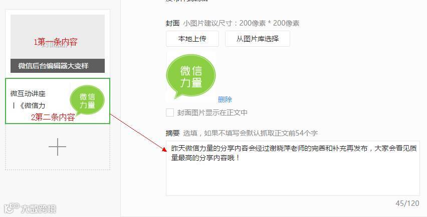 此前只有单图文时可以添加摘要,这次二条及后面的文章均可以添加摘要,方便大家分享给好友或微信群时自动将精华内容呈现。