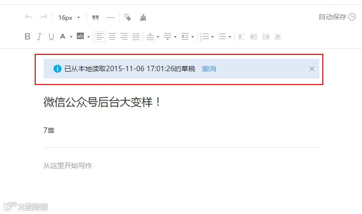➤自动保存、选择读取草稿,如果你关闭编辑器重新打开,系统会自动加载本地上次退出时编辑器内的内容,如果不需要这些内容,点击撤消则有可能清空内容,或者加载云端的内容。