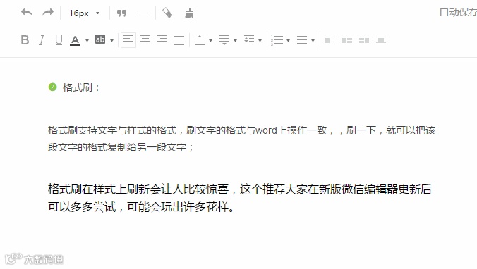 格式刷支持文字与样式的格式,刷文字的格式与word上操作一致,刷一下,就可以把该段文字的格式复制给另一段文字;