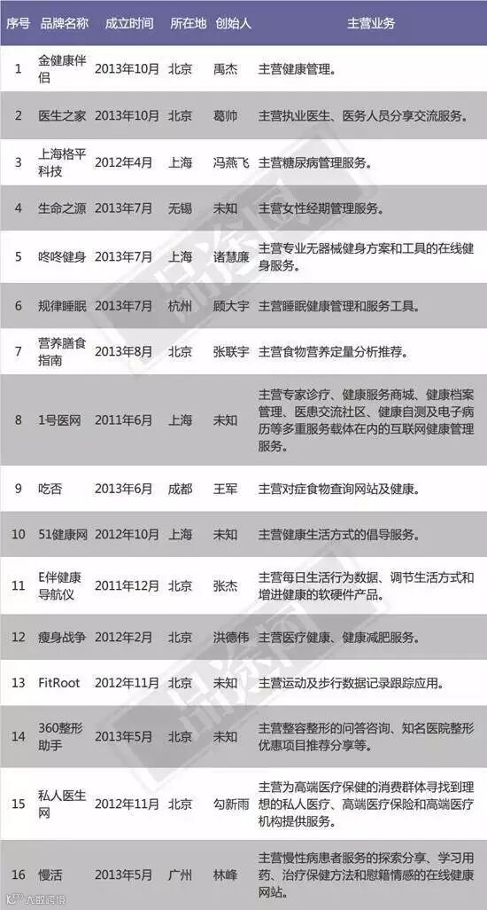 2. 通过列表可以看出,死亡企业多以健康管理为主,从事该领域的企业较多,不利于形成竞争优势,一旦没有巨头注资,很容易被行业淘汰。