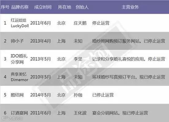 1、低频消费,缺乏资源。婚嫁行业的互联网化进程较短。在本次盘点中盘点出的已经停止运营的大部分企业成立时间稍早。由于婚嫁行业是低频需求的行业,如何提高用户粘性,不断的拓展产业链(横向或纵向)就成了每个企业亟待思考的问题。