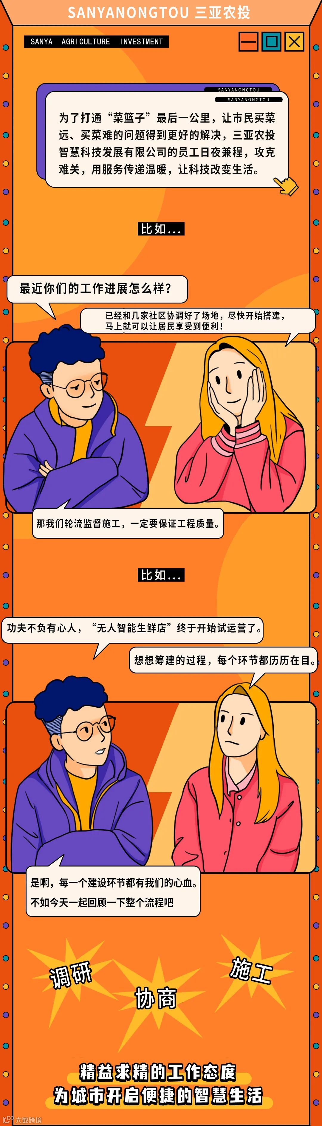 无人智能生鲜店的引进是三亚农投集团的一项重要工作,更是完善城市基础设施的重大民生工程,它的建设需要切实可行的方案作为依托。在长达数月的反复商议中,无人智能生鲜店实施方案的每一条意见都反映了群众需求,每一个细节都体现了人文关怀,在方案得到充分的优化升级后,项目依照流程如期展开。