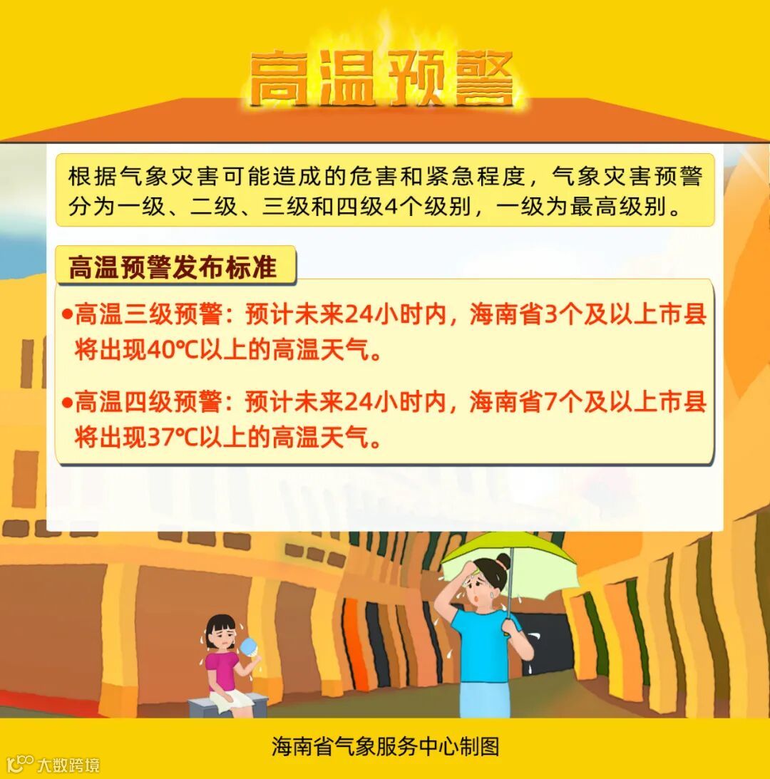 海南省气象局2021年06月27日16时30分发布高温四级预警:预计28日白天,海口、临高、澄迈、儋州、白沙、昌江、屯昌、定安、琼海、保亭、东方11个市县的大部分乡镇及洋浦区将出现37摄氏度以上的高温天气,请有关单位做好防暑降温工作。