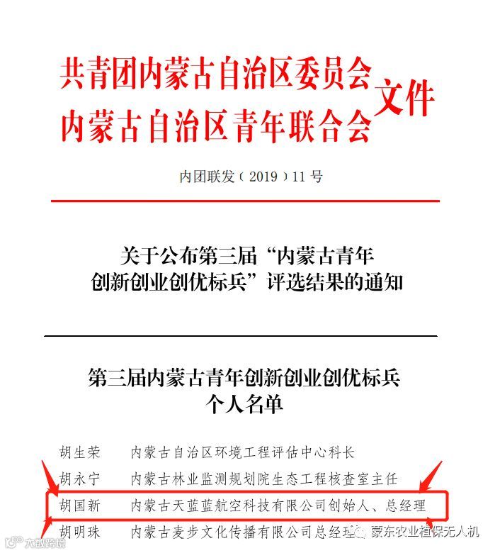 恭喜天蓝蓝航空科技有限公司总经理胡国新被内蒙古共青团委员会评选为“内蒙古青年创新创业创优标兵”