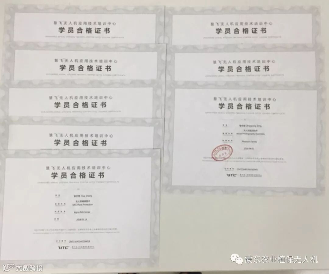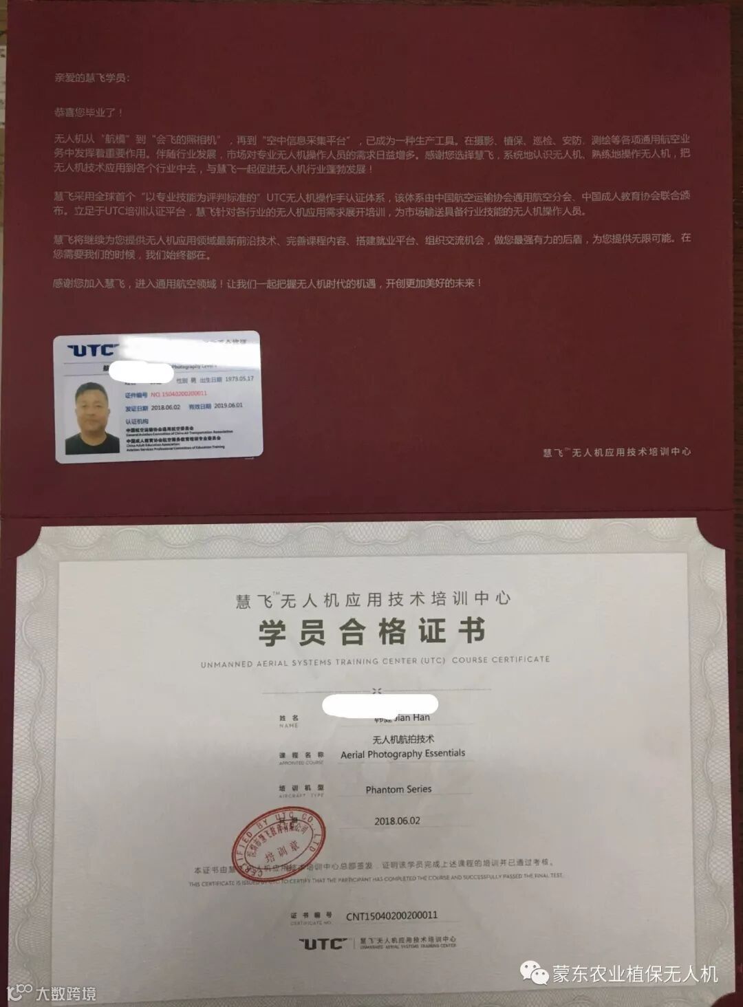 课程颁发由中国航空运输协会和中国成人教育协会认证的《UTC无人驾驶航空器系统操作手合格证》+慧飞颁发的《慧飞无人机应用技术培训中心学员合格证书》。
