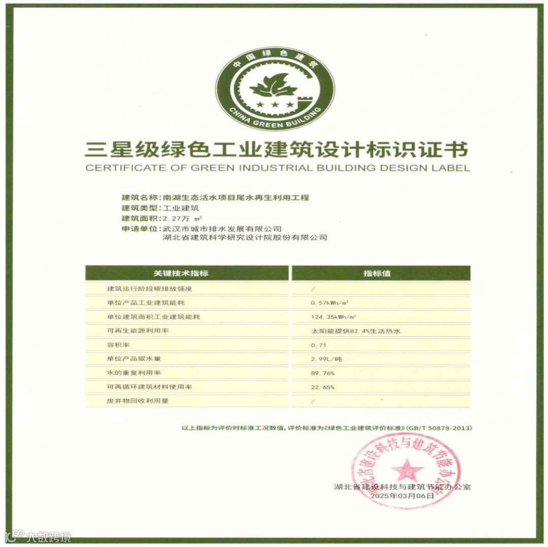近日,由武汉城投武汉控股公司投资建设的南湖生态活水项目尾水再生利用工程荣获三星级绿色工业建筑设计标识证书,成为湖北省市政行业首个获得绿色工业建筑最高等级认证的项目。武汉城投武汉控股公司通过“科技治水+低碳转型”的创新实践,为长江经济带生态保护与城市高质量发展提供了有力支撑和生动范例。